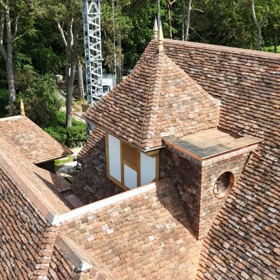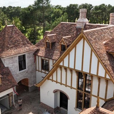 Het bestaande hoofdgebouw werd volledig ontmanteld, heropgebouwd en uitgebreid. De woning kreeg een volledige onderkeldering met garage, wellnessruimte en technische lokalen. De uitbreiding werd ontworpen in een klassieke architectuurstijl met verfijnde details, hoogwaardige materialen en een uitzonderlijke afwerkingsgraad. De gevels werden opgetrokken in gerecupereerde Bourgondische gevelsteen en afgewerkt met Massangis-natuursteen voor onder meer de boogconstructies en plinten. Dankzij een chipper- en kaleiafwerking vloeien oud en nieuw subtiel in elkaar over. Ook het dak werd volledig vernieuwd en bekleed met gerecupereerde tegelpannen. De daktimmerconstructie en het eiken vakwerk werden in het atelier van Verstraete.team ontworpen, gemodelleerd en geprefabriceerd.